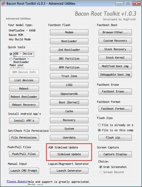 把升级包下载到电脑上,把手机和电脑用数据线连接起来,adb sideload就能从电脑读取升级文件后直接写入手机的/system分区,完全不访问/data,就不再有加密分区的限制。Bacon Root Toolkit提供了一键adb sideload的功能,点击下图按钮后,按照软件提示进行操作即可写入数据。